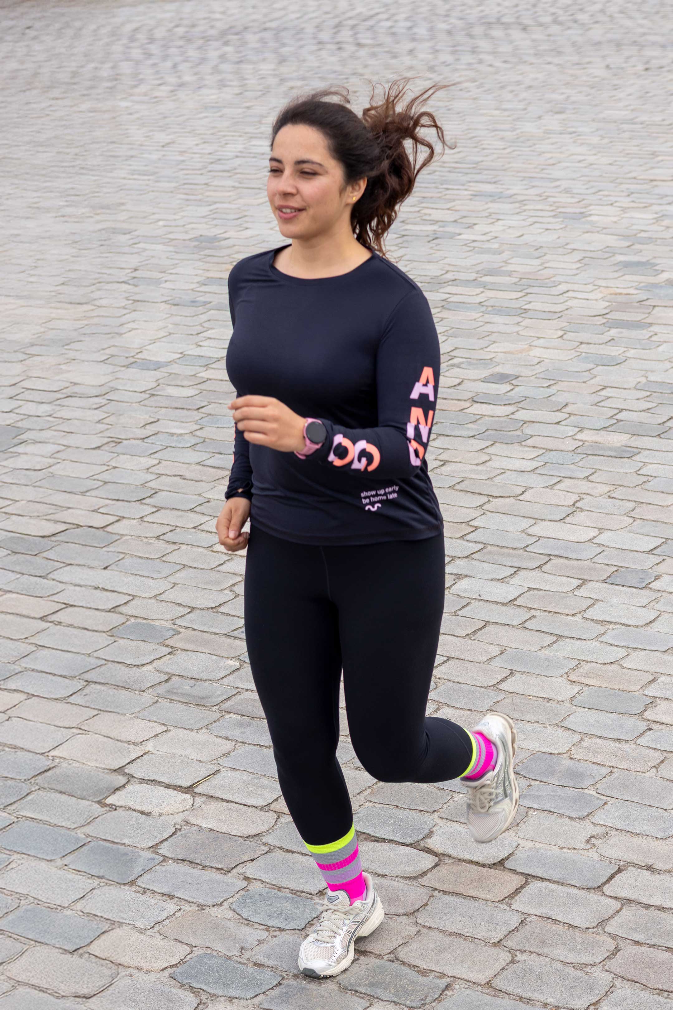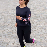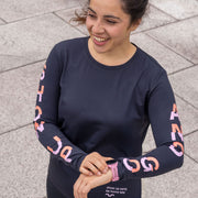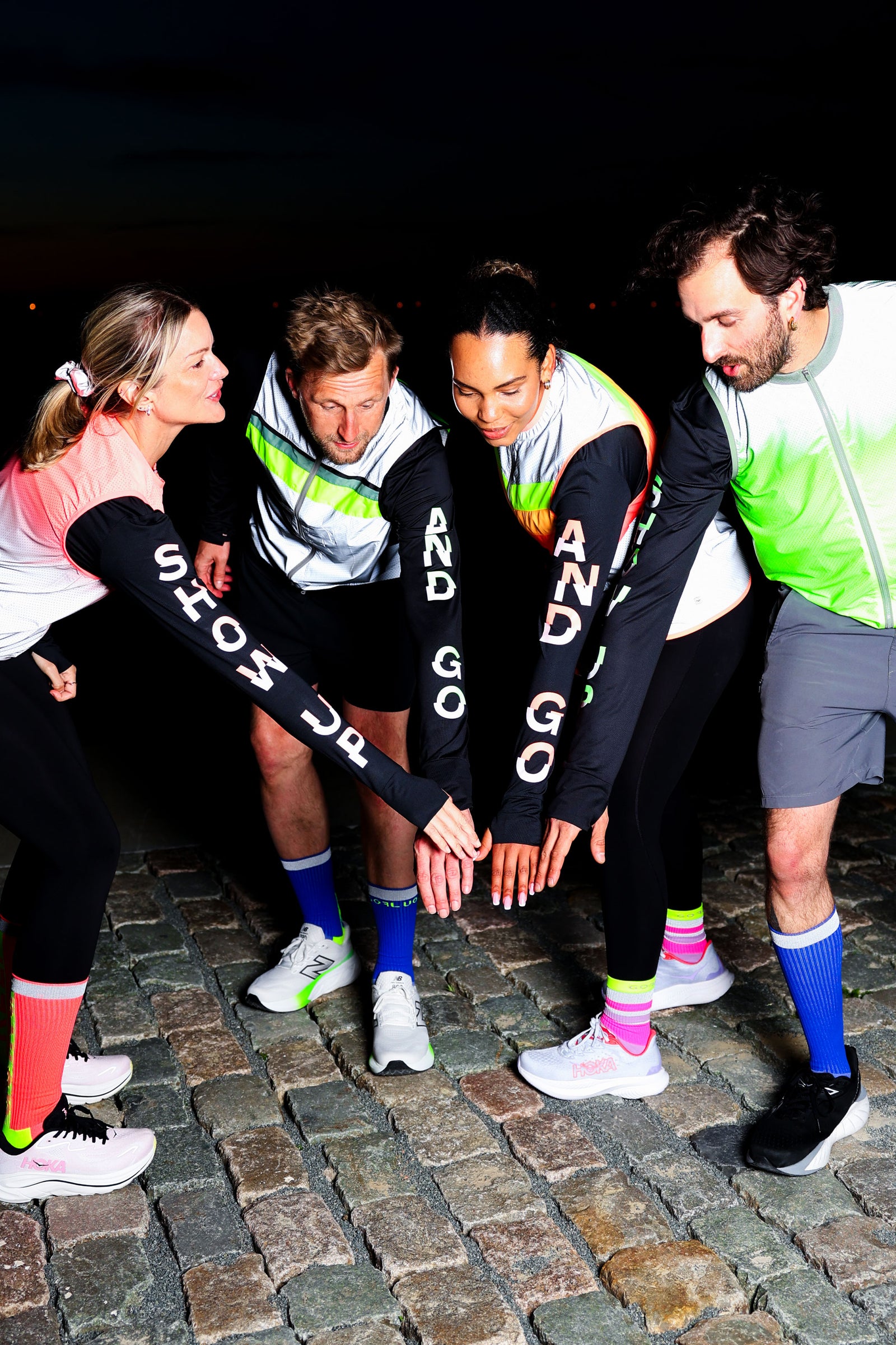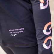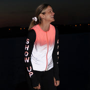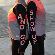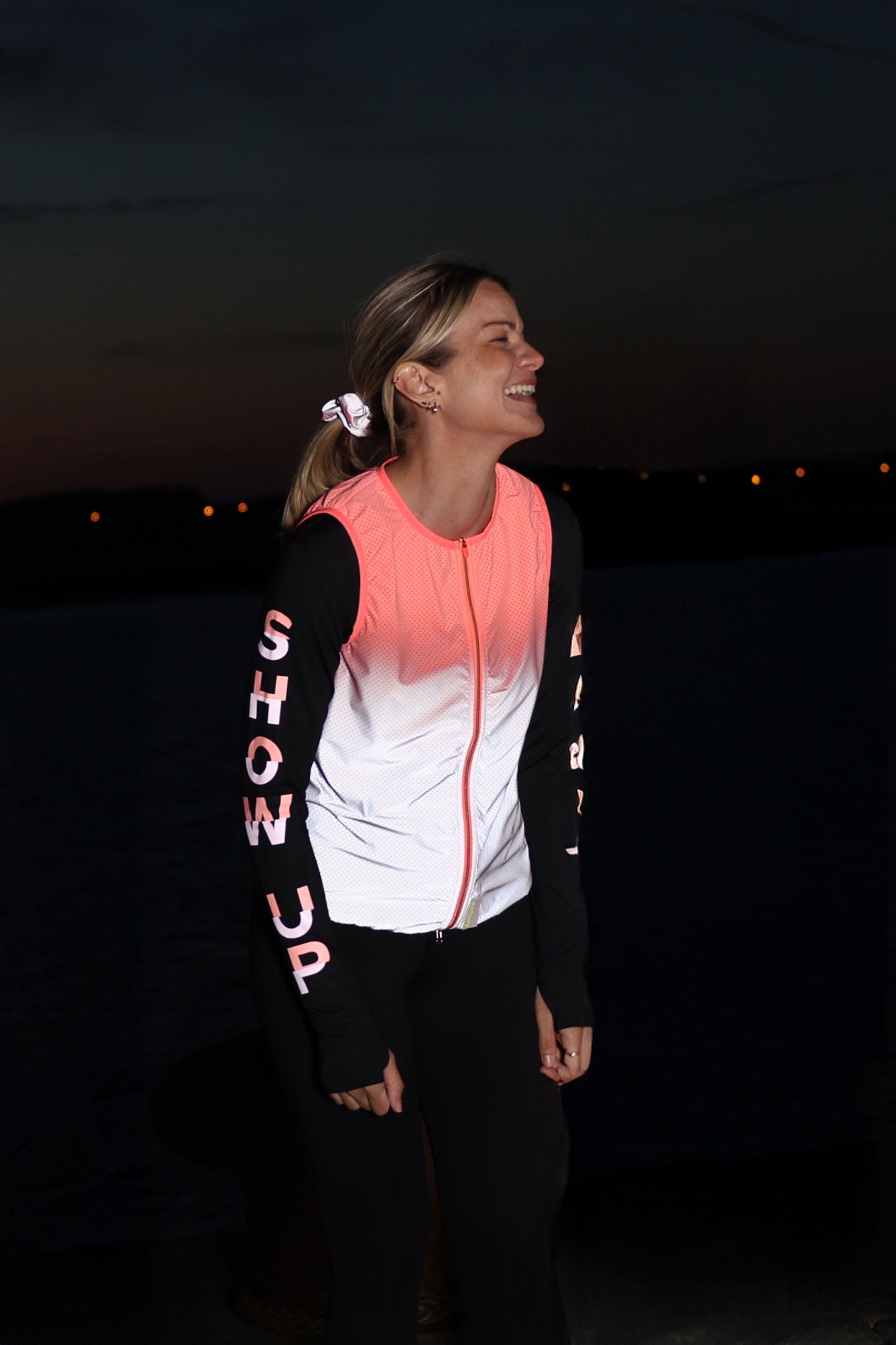 the bold letters on the sleeves are fully reflective in the dark, ensuring you stay visible in low light conditions. by day, the top half glows in classy coral, while the bottom half shimmers in pink blush. pair this top with your favorite bodyglower to maximize your visibility.