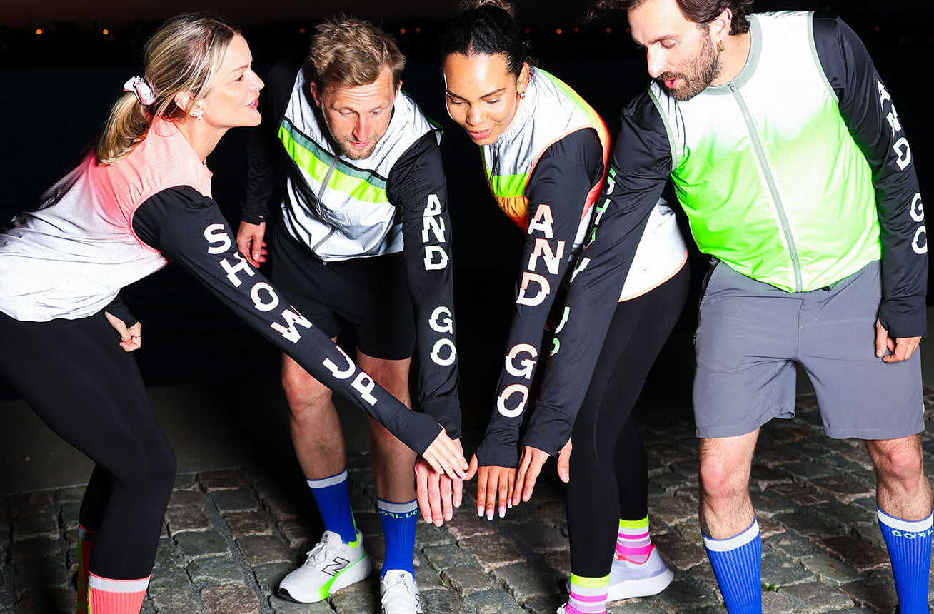 the quote is split across both arms: ‘show up’ on the left, ‘and go’ on the right. together, they form one full message, bringing you the cheer you need!