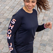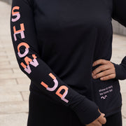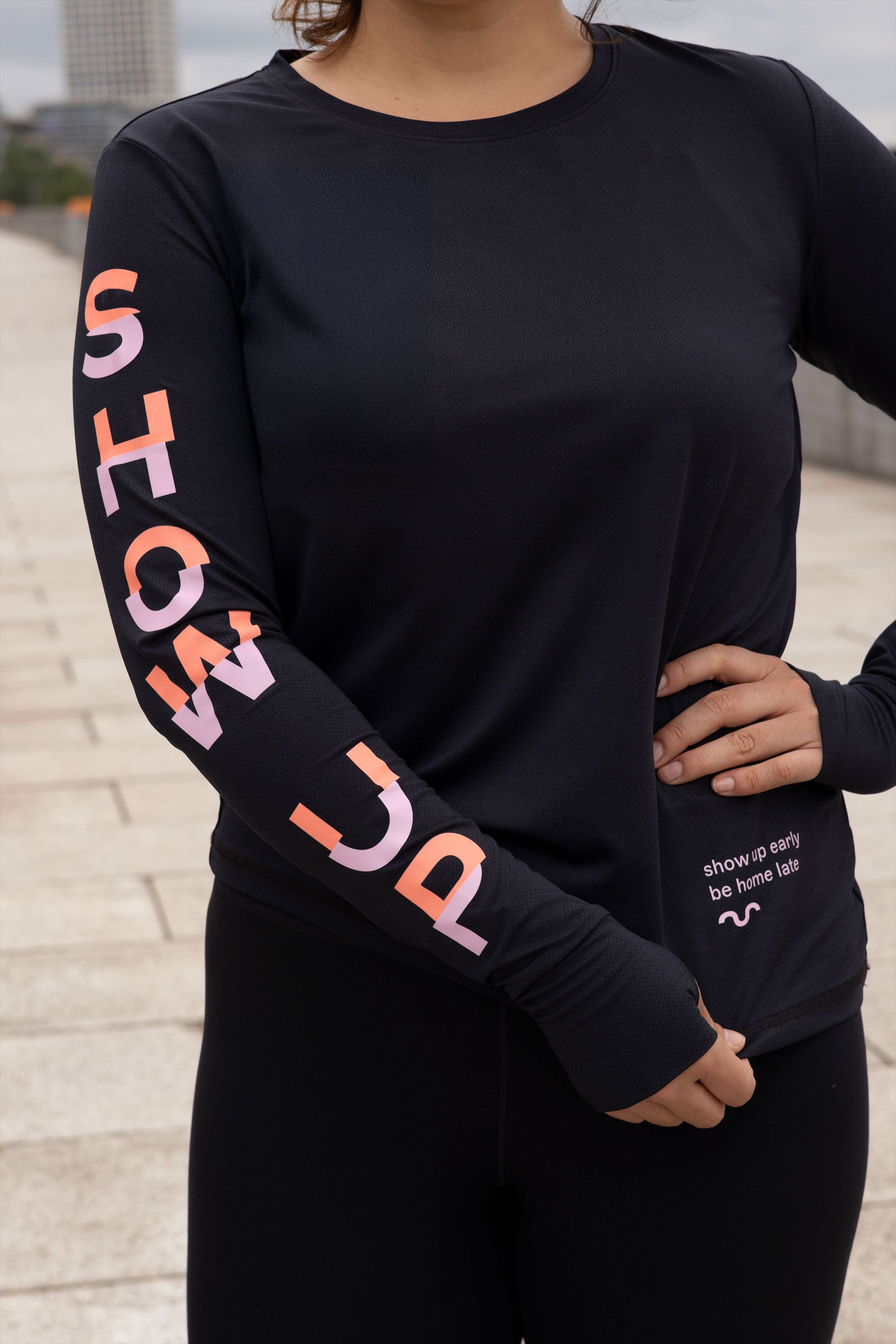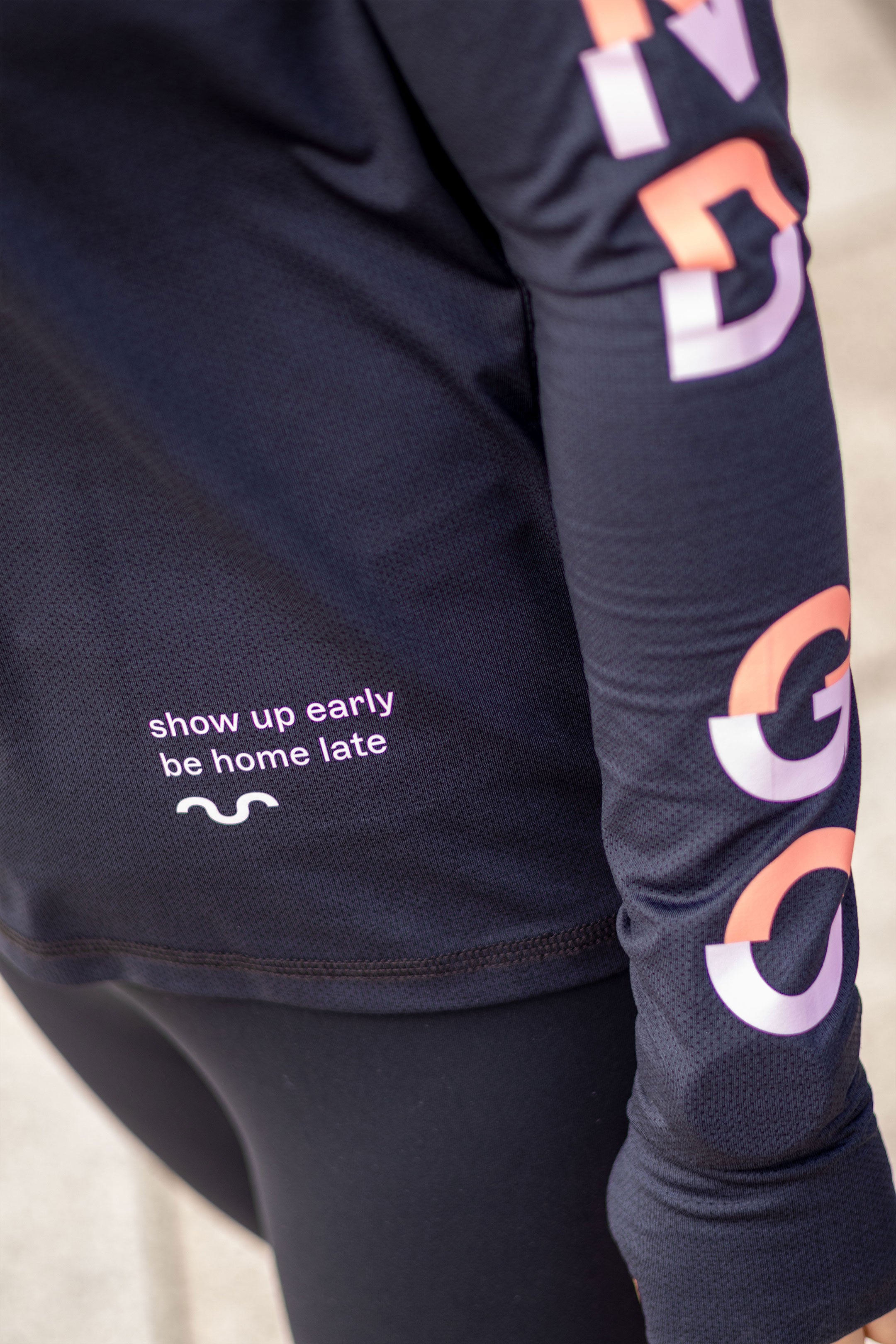 - coral-blush pink reflective quote ‘show up and go” on the sleeves