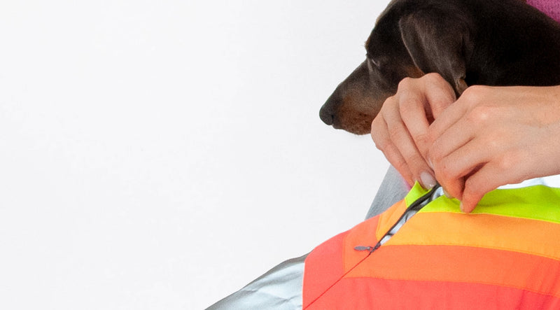 si votre chien porte un harnais, aucun problème! dans la couture centrale du dos, vous trouverez une fermeture éclair à double curseur. ouvrez-la pour faire passer la boucle du harnais et l'attacher à votre laisse.