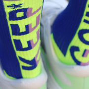 blaze through the night with the reflective hoop stripe at the top. during the day the bold neon colors and shiny quote will keep you going with a smile!