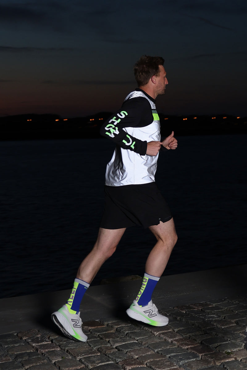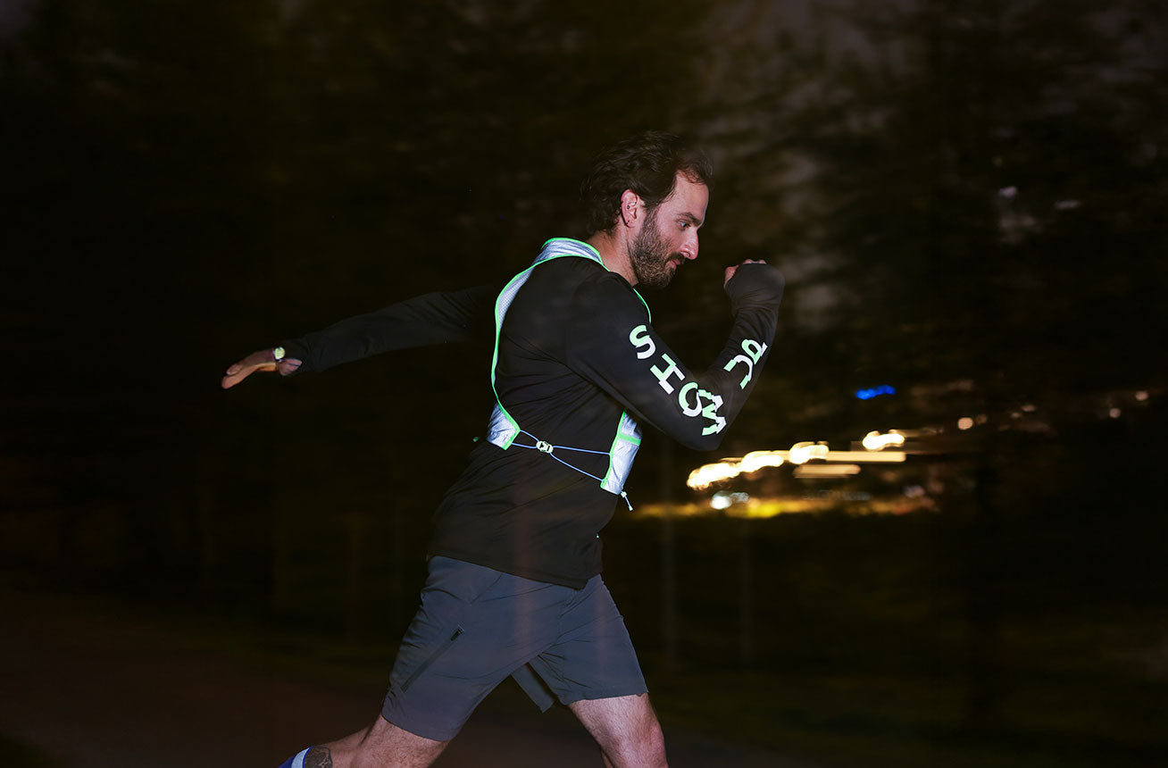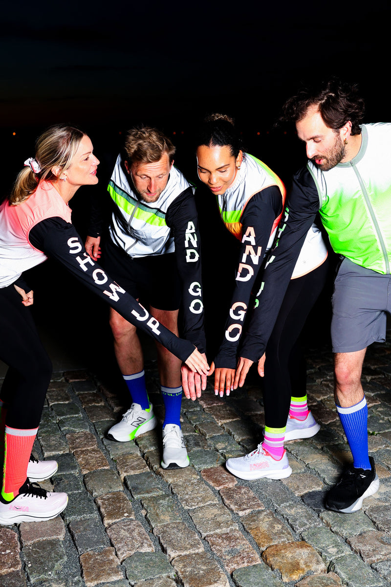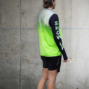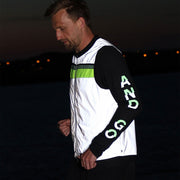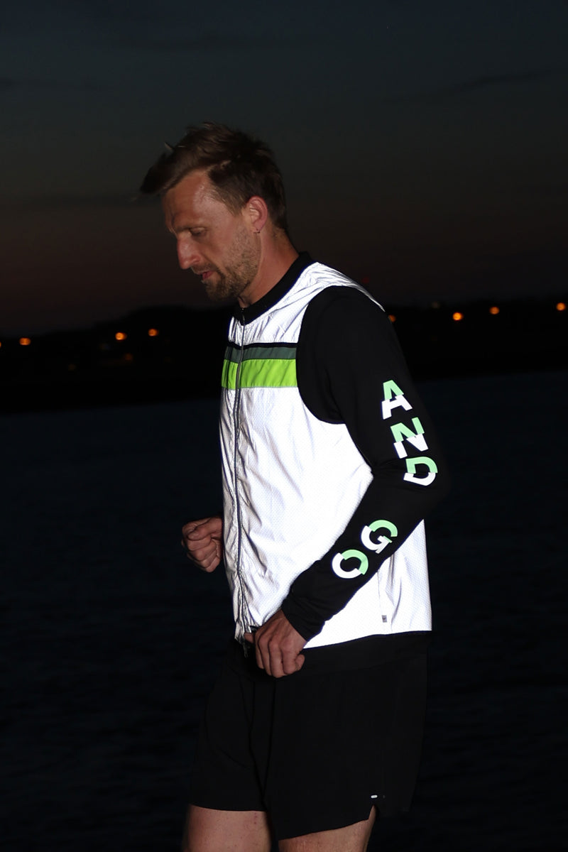 the bold letters on the sleeves are fully reflective in the dark, ensuring you stay visible in low light conditions. by day, the top half glows in vibrant green, while the bottom half is subtle grey. pair this top with your favorite bodyglower to maximize your visibility.