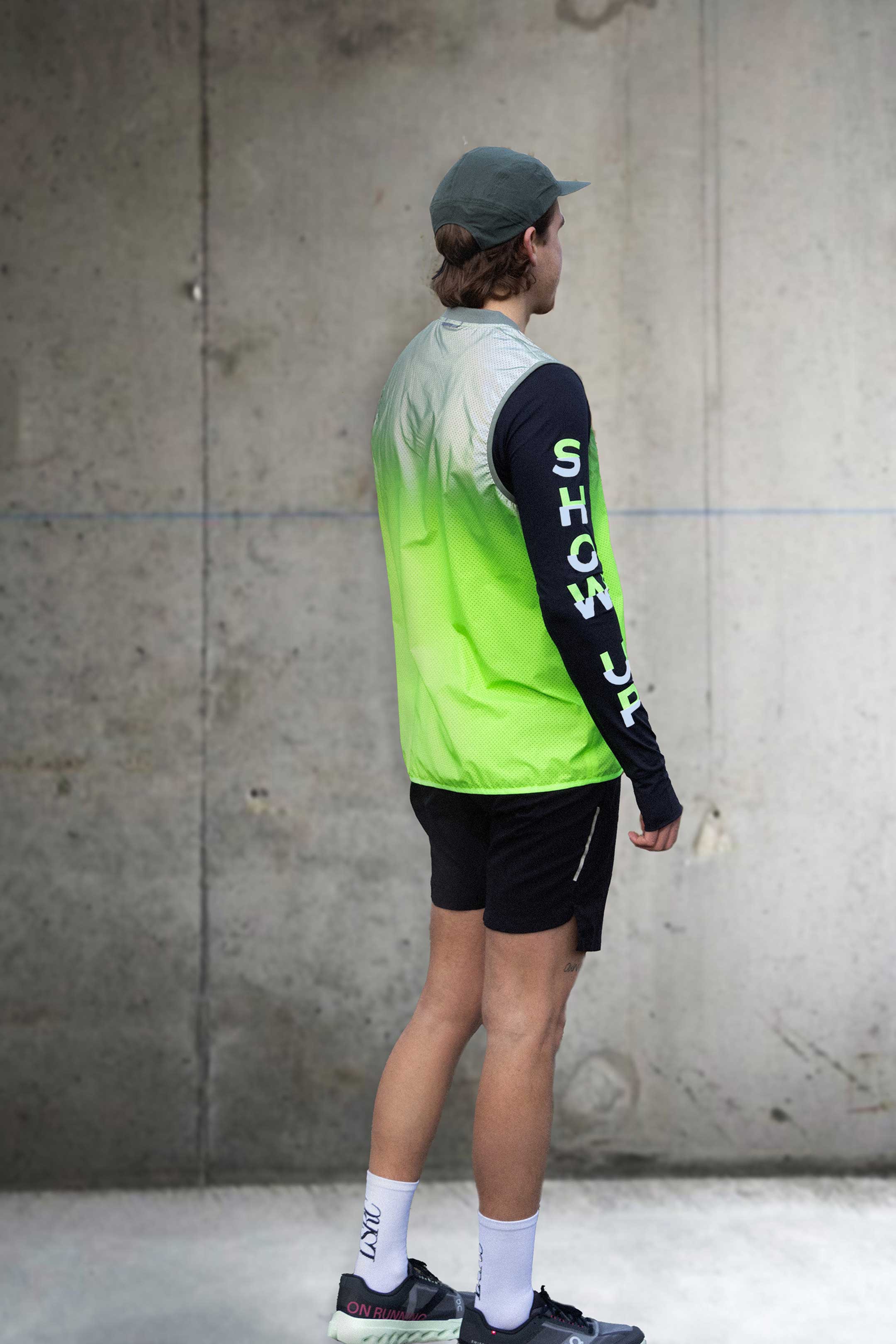 let your sleeves do the talking! each letter is cut in half, our subtle translation of speed, giving the typography a dynamic, on-the-go feel, like a flash passing by. during the day, the top half shines in fluo green while the bottom is soft grey. all letters fully reflect at night - yes, also the green part!