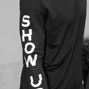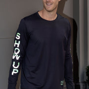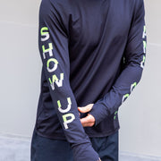 the quote is split across both arms: ‘show up’ on the left, ‘and go’ on the right. together, they form one full message, bringing you the cheer you need!