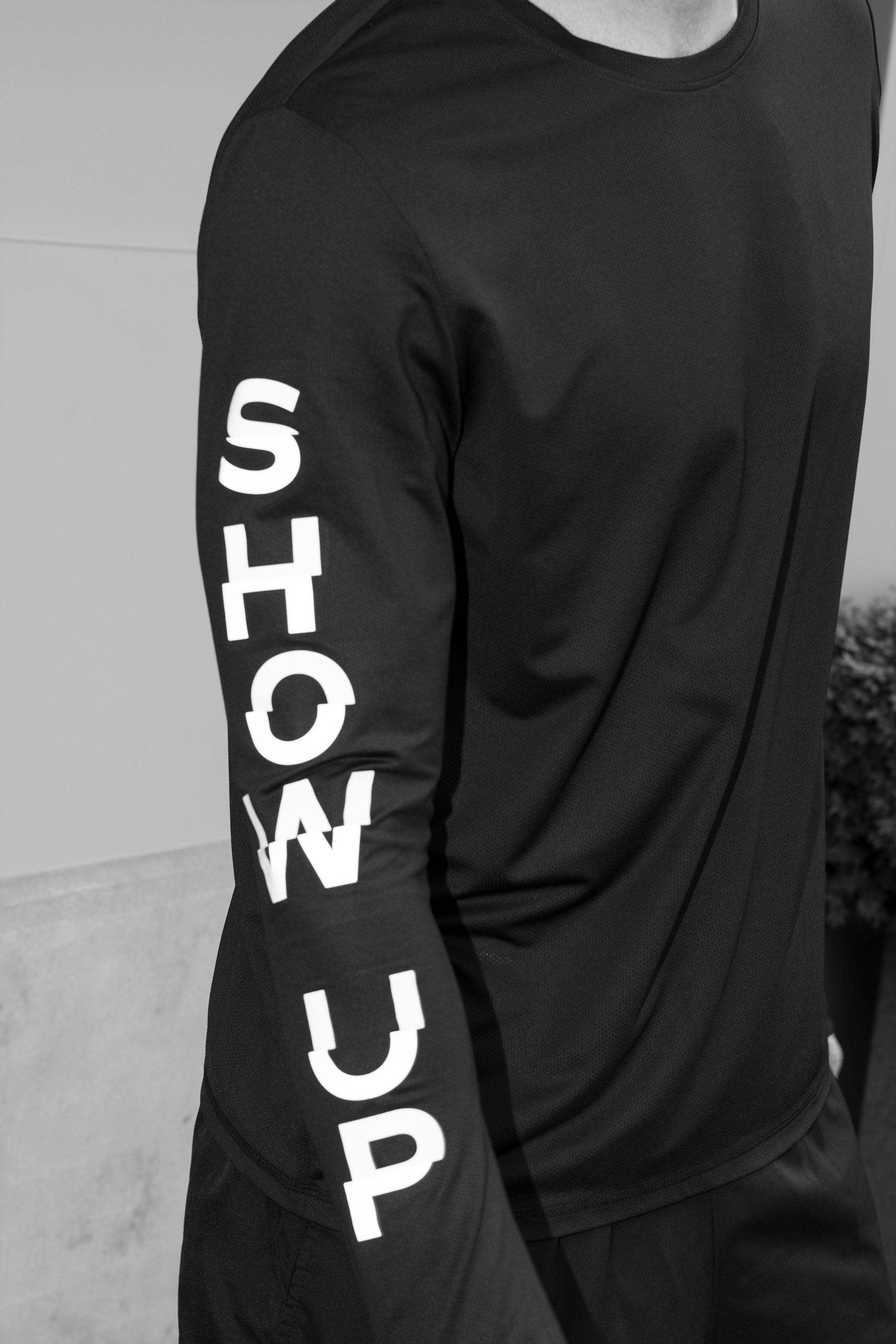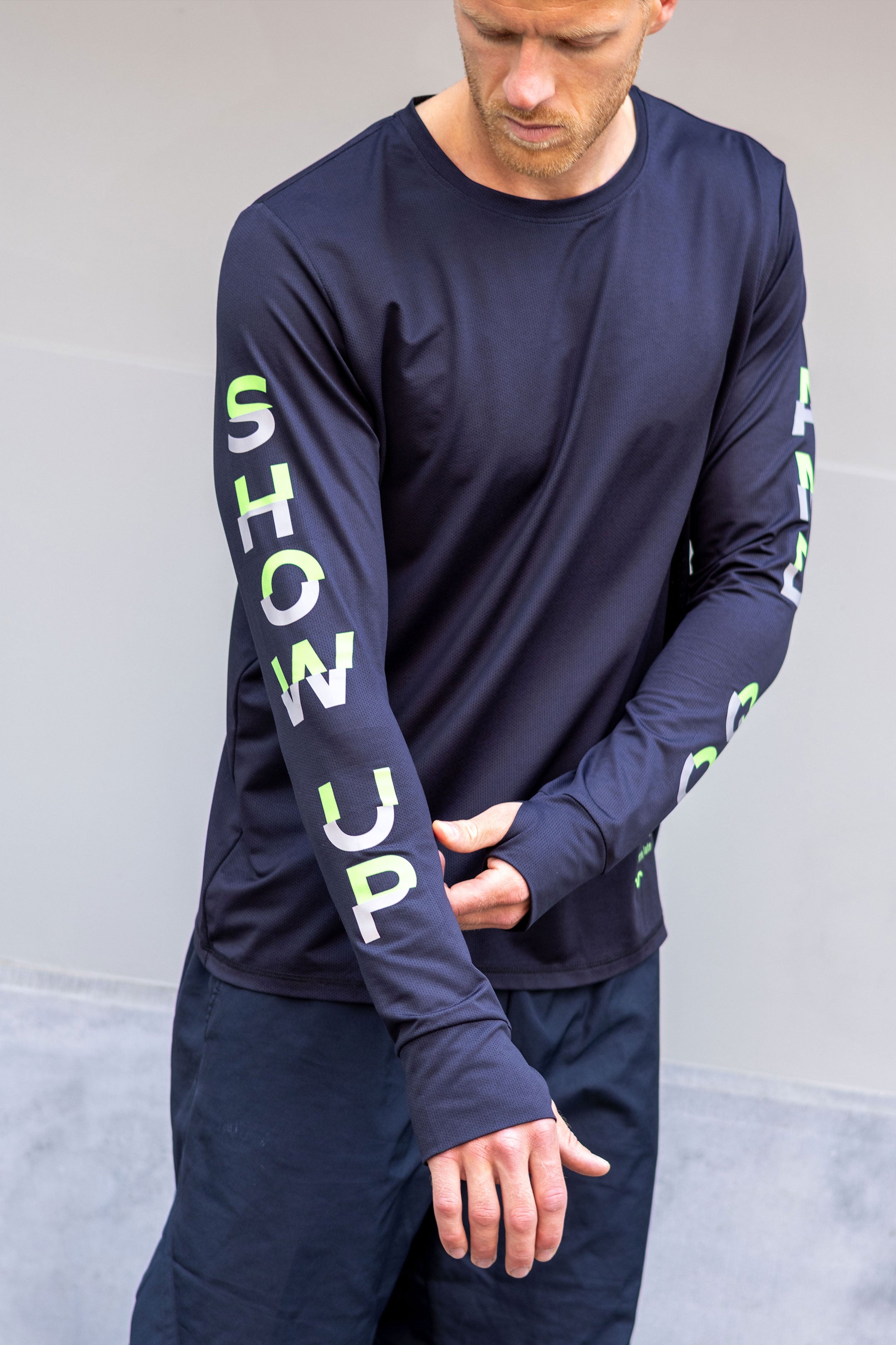 - green-grey reflective quote ‘show up and go” on the sleeves