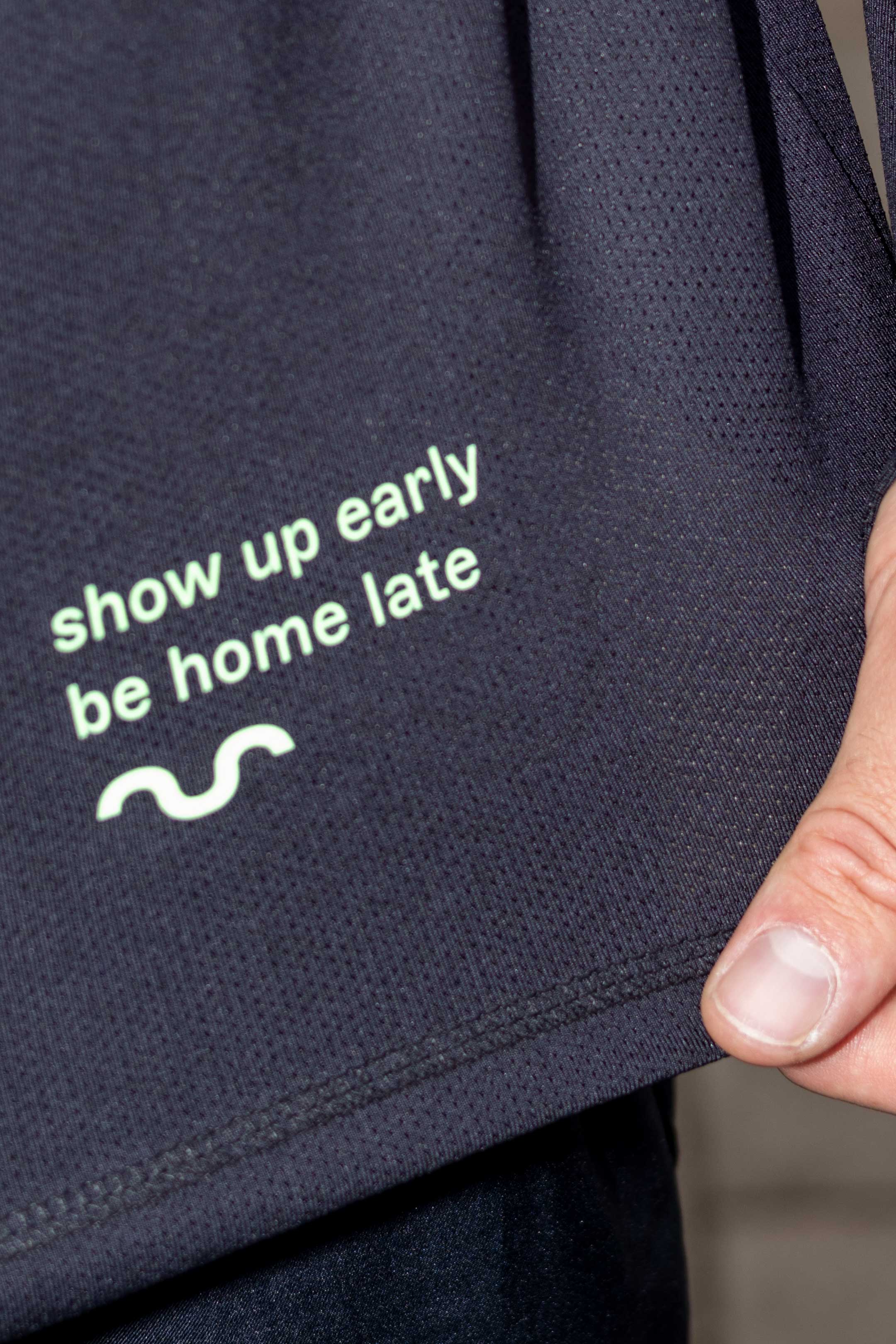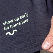 - small green reflective quote: “show up early, be home late” in the front
